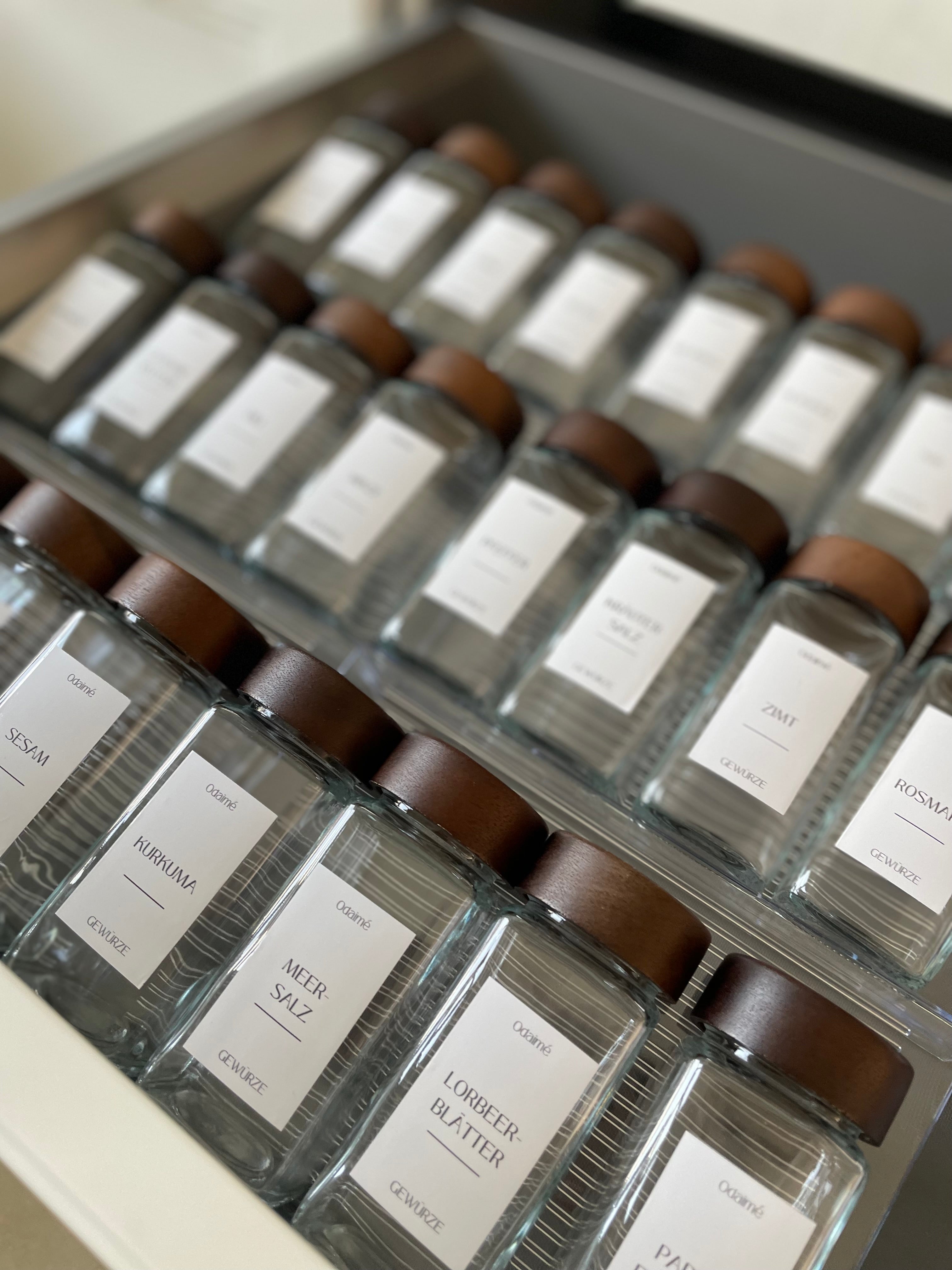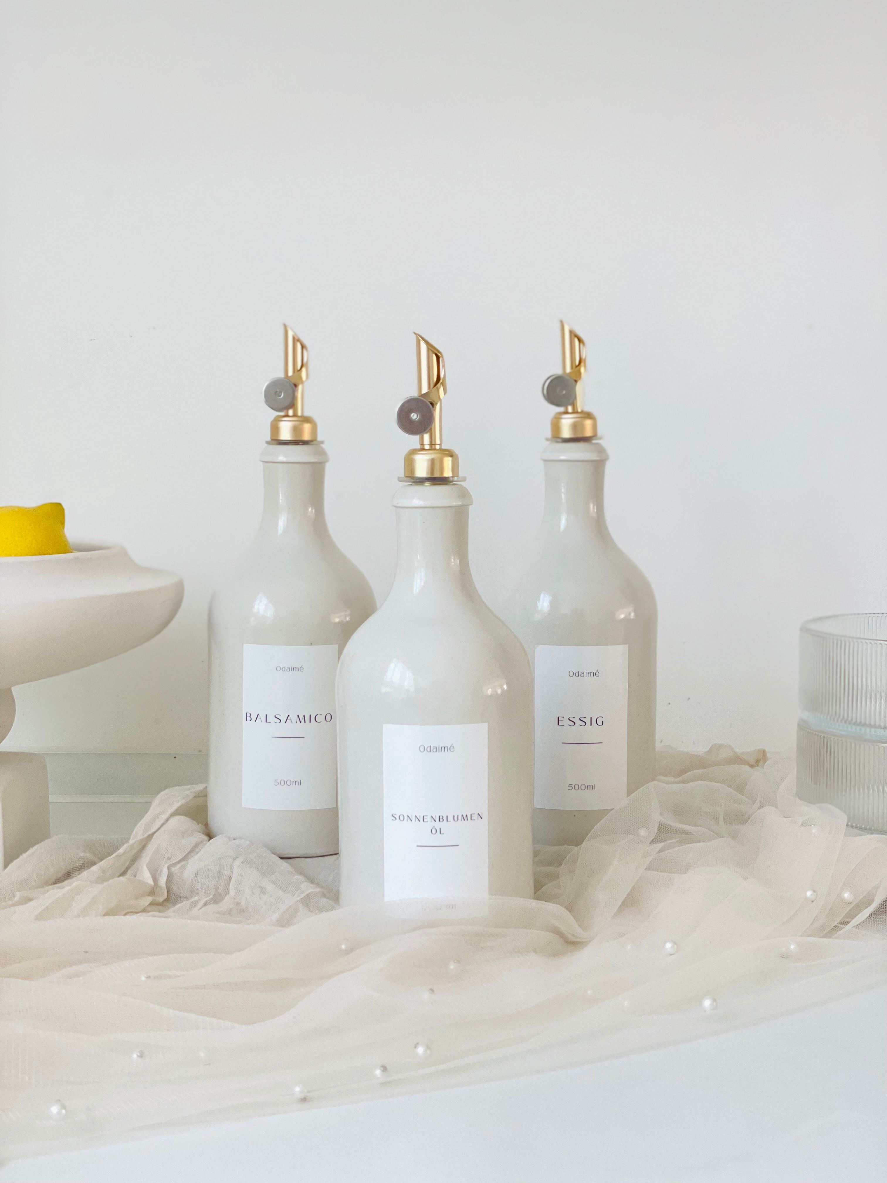 Keine Kompromisse: Wähle aus einer breiten Auswahl an Etiketten für deine Gewürzgläser, Seifenspender und Ölspender. Mit unseren sechs Ausgießerfarben fügen sich die Öl- und Essigspender harmonisch in jede Küche ein - stilvoll, edel und praktisch.